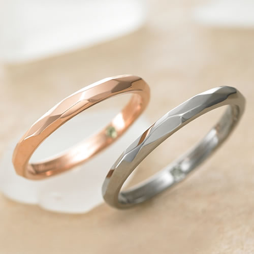 キュービックカットされたペアリングで、カット面が多くキラキラと指元を輝かせるデザインです。女性はピンク、男性はブラックでコーティングされており上品な仕上がりになっています。
