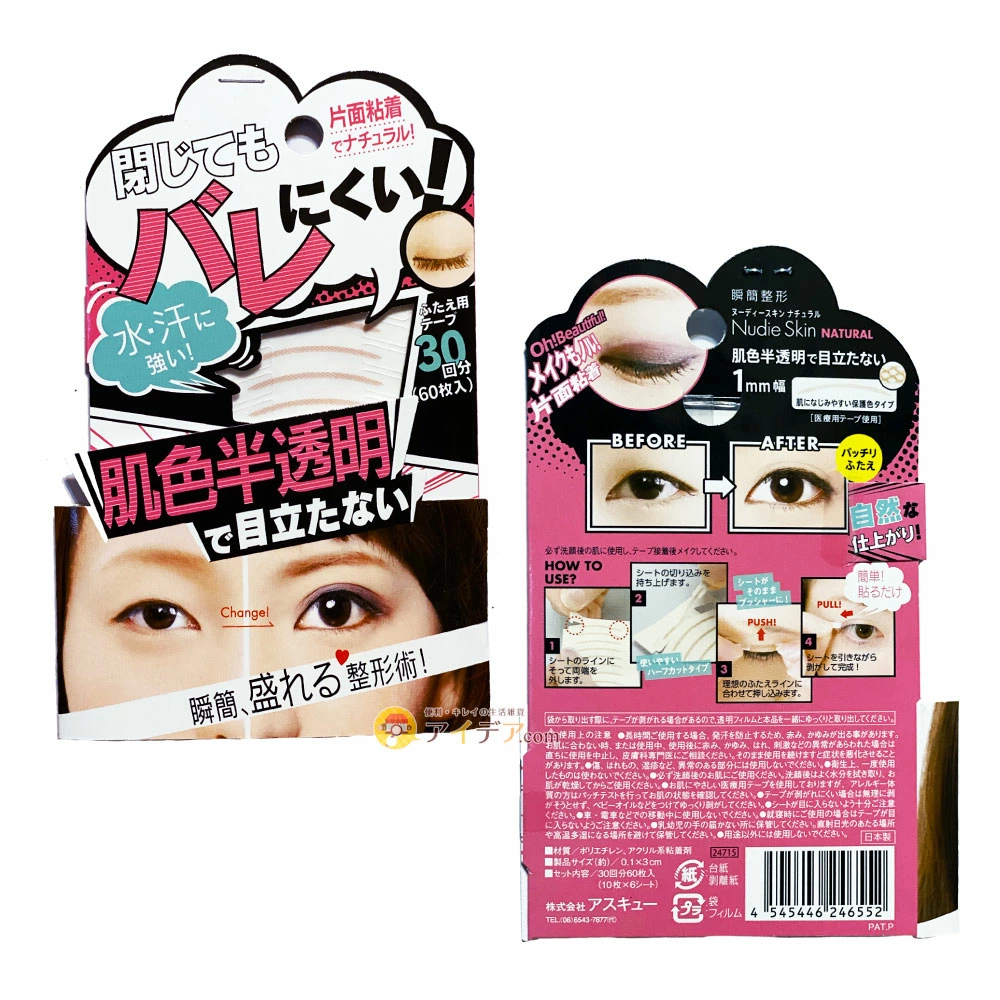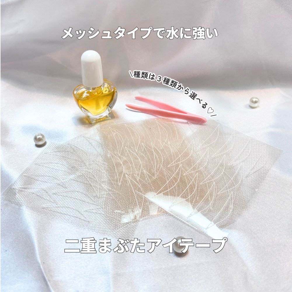 特殊なメッシュフィルムを使用していつアイテープになります。目に見えないほど肌になじむのが実感できて、目をつぶっていても貼っているのかどうか分かりません。