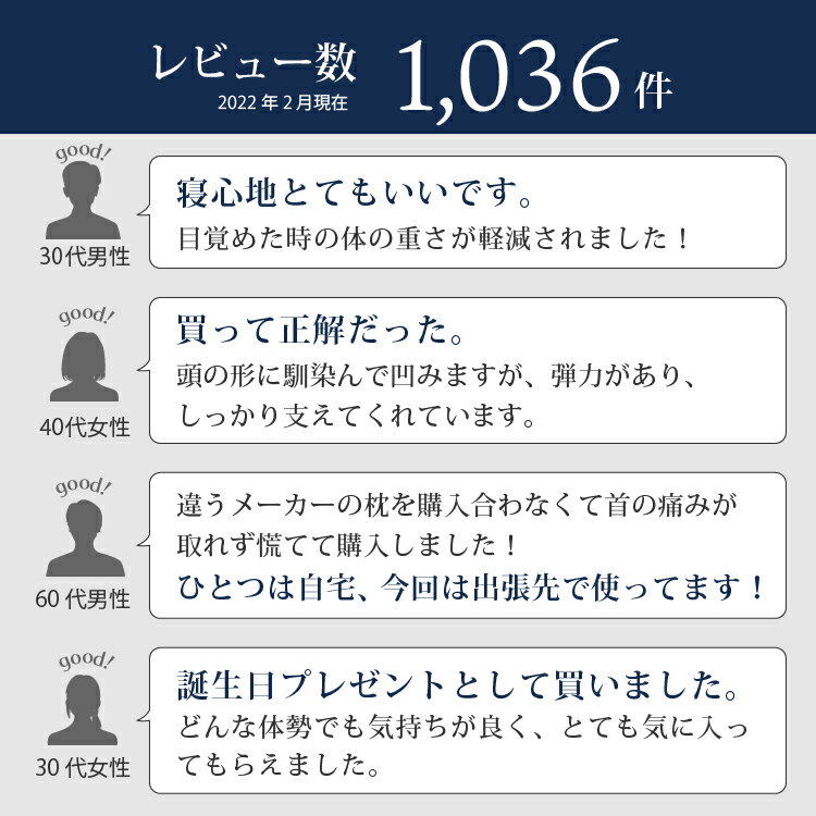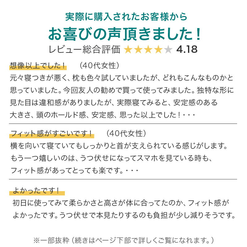きれいな姿勢を保てるため、コリや気道の圧迫を軽減してくれる効果にも期待ができます。低反発のウレタン素材を採用しているため、体圧を均一に吸収して分散してくれるのも嬉しいポイントです。