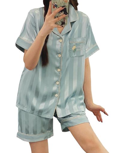 アイスシルク素材でシルクのような肌触りのルームウェアです。アイスシルク素材は滑らかで肌に優しく、涼しく快適な眠りを提供します。ストライプ柄と胸元に施された精緻な花刺繍が、シンプルながら女性らしさとエレガントさを引き立て、上品で可愛い印象を与えます。