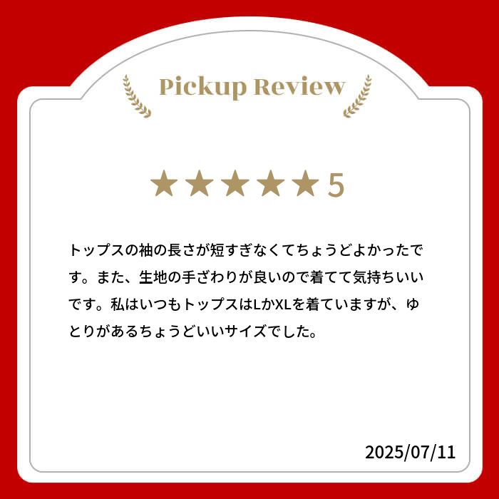 ふわふわとした柔らかい肌触りで、気になるお腹周りを隠せるゆったりめのシルエットがポイント。トップスは袖が少し短くパンツは七分丈なので、手首と足首を出せて圧迫感なく着られます。