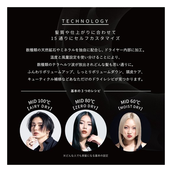 コンパクトながら最大毎分1.6立方メートルの大風量を実現しており、速乾性に優れているのも魅力のひとつになります。速乾ノズル・根元速乾ノズル・セットノズルを使い分けることで、好みのスタイリングを実現できるのもポイントです。