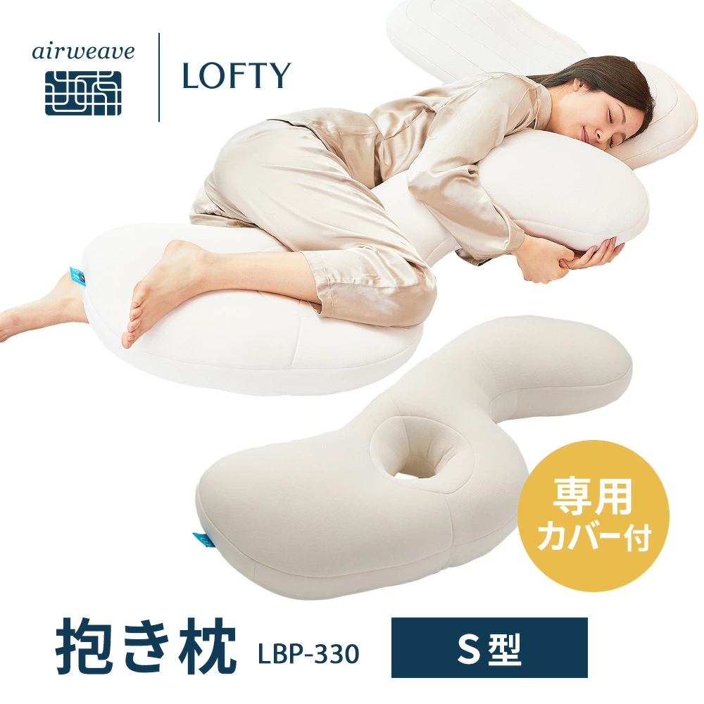 S字型で、中央部分に穴が開いているのが特徴的な抱き枕です。穴の部分には膝や大腿部を置くことができ、そうすることで横向きの際の寝姿勢を安定させることが可能。