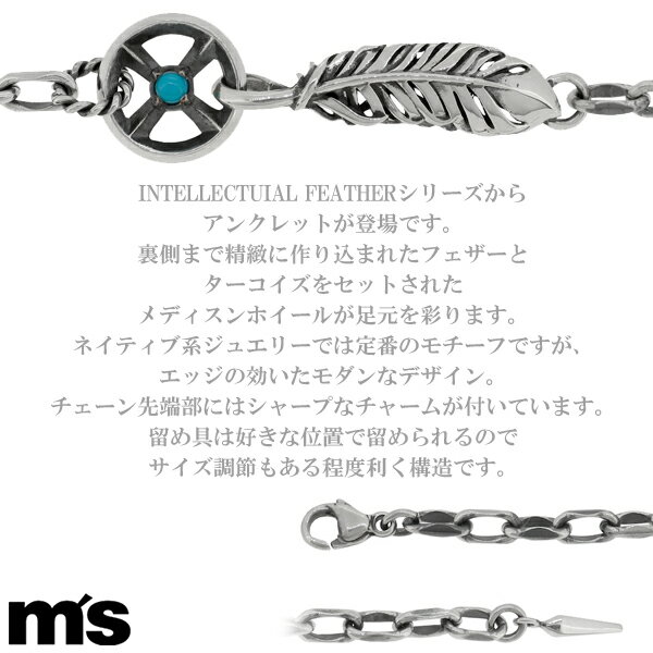 M’s collectionも男性に人気のブランドです。こちらはINTELLECTUIAL FEATHERシリーズのアンクレットになります。裏側まで精緻に作り込まれたフェザーとターコイズをセットされたメディスンホイールが足元を彩ります。