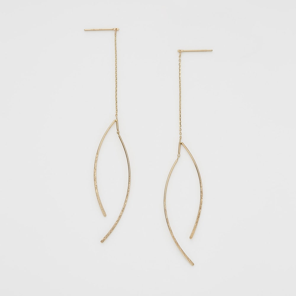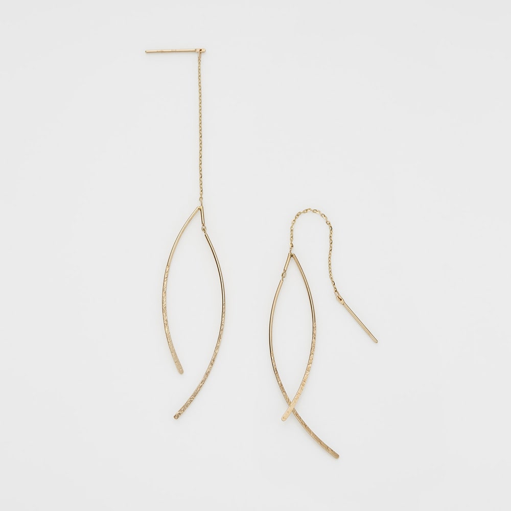 テクスチャーの入った異なる仕上がりの地金が2連になった、シンプルながらもこだわりのある作り。ほんのりひねった動きがあるフォルムですので耳元にアクセントを加えてくれる、着用時により魅力を発揮するデザインです。もちろんピアスチャームによっては組み合わせることのできるサイズですので、お好みのチャームを合わせてお楽しみください。