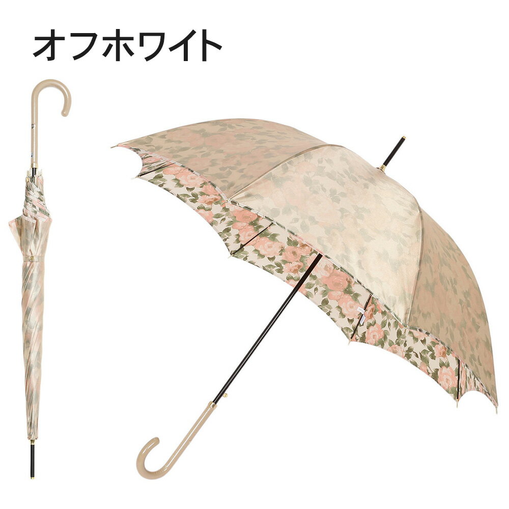 無地とフラワー柄のコンビネーションが美しい長傘です。ふちにはブランド名が上品な筆記体で施されており、控えめなアクセントを加えています。ワントーンで描かれた花柄が、よりエレガントな印象をプラスしています。