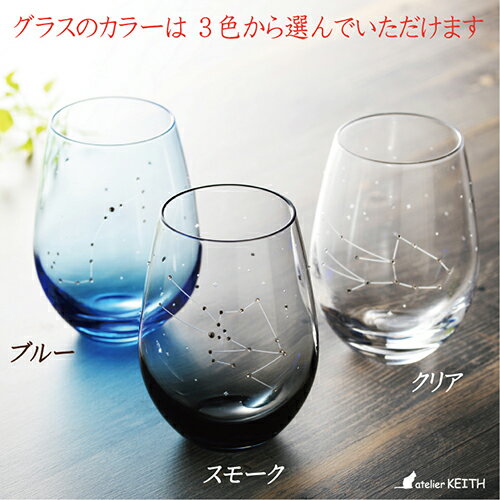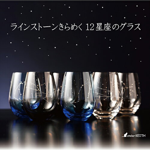 優雅な曲線が美しいタンブラーグラスの全面に満天の星空をサンドブラストで彫刻して、12星座をひとつラインストーンで表現しています。シンプルで星座のきらめきが美しいグラスです。
