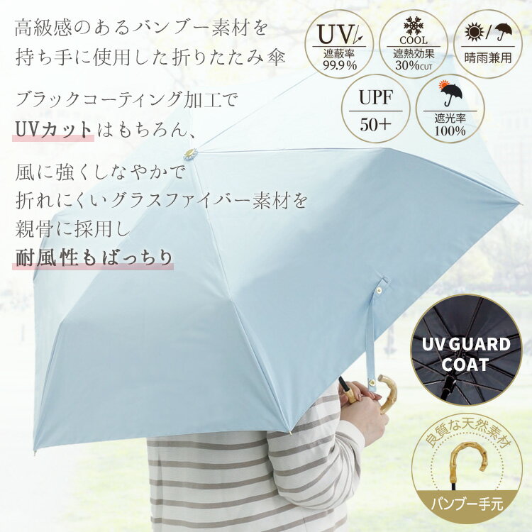 こちらは、高級感のあるバンブー手元を使用した折りたたみ傘になります。傘生地の内側にはブラックコーティングが施されておりUV遮蔽率99.9%、遮熱効果30%カット、UPF50+でしっかりUVカットしてくれます。風に強くしなやかで折れにくいグラスファイバー素材を親骨に採用し、耐風性も抜群です。