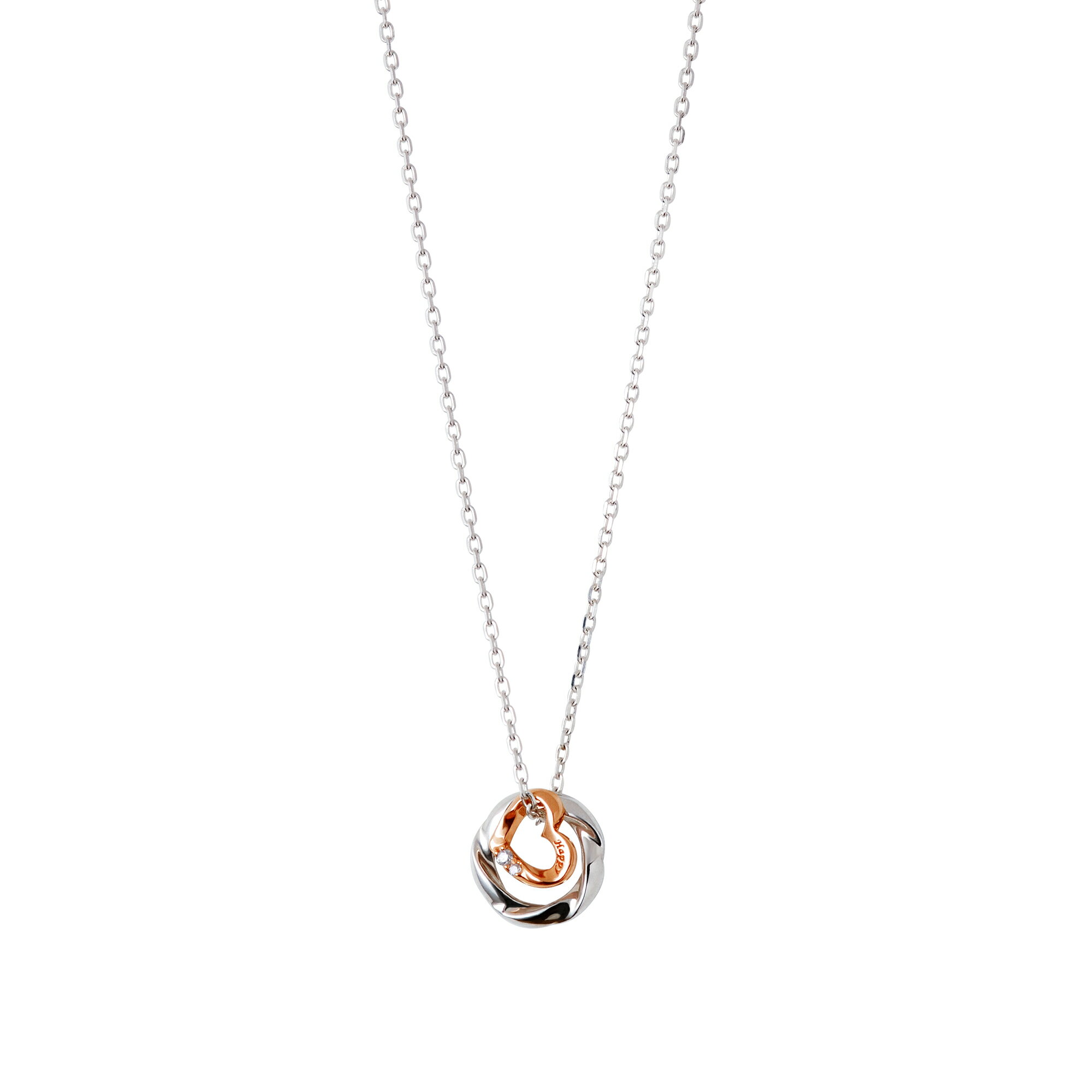 メビウスの輪をイメージしたリングと、ピンクのハートを組み合わせたおしゃれなネックレスになります。ハートモチーフにはダイヤモンドがあしらわれており、ひかえめな華やかさをプラスしています。