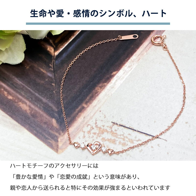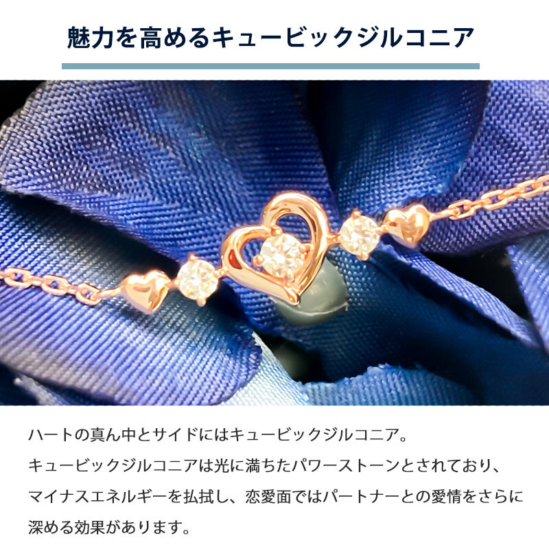 ハートの真ん中とサイドにキュービックジルコニアが付いているピンクゴールドコーティングのブレスレットです。キュービックジルコニアは、光に満ちたパワーストーンとされており、マイナスエネルギーを払しょくし、恋愛面においてはパートナーとの愛情をさらに深める効果があるといわれています。