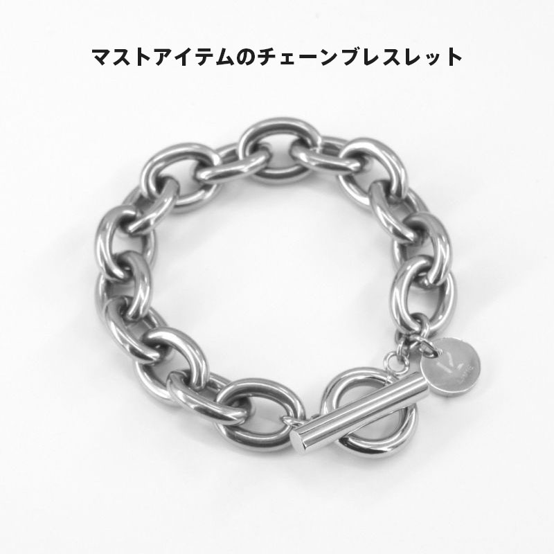 LHME定番ブレスレットをアップデートした厚感あるチェーンブレスレット。ボリュームのあるアズキチェーンは着けごたえ抜群です。Tバー&マンテルは光沢感のある鏡面仕上げになり、Tバーを太くデザインすることで落ちにくいようになっています。