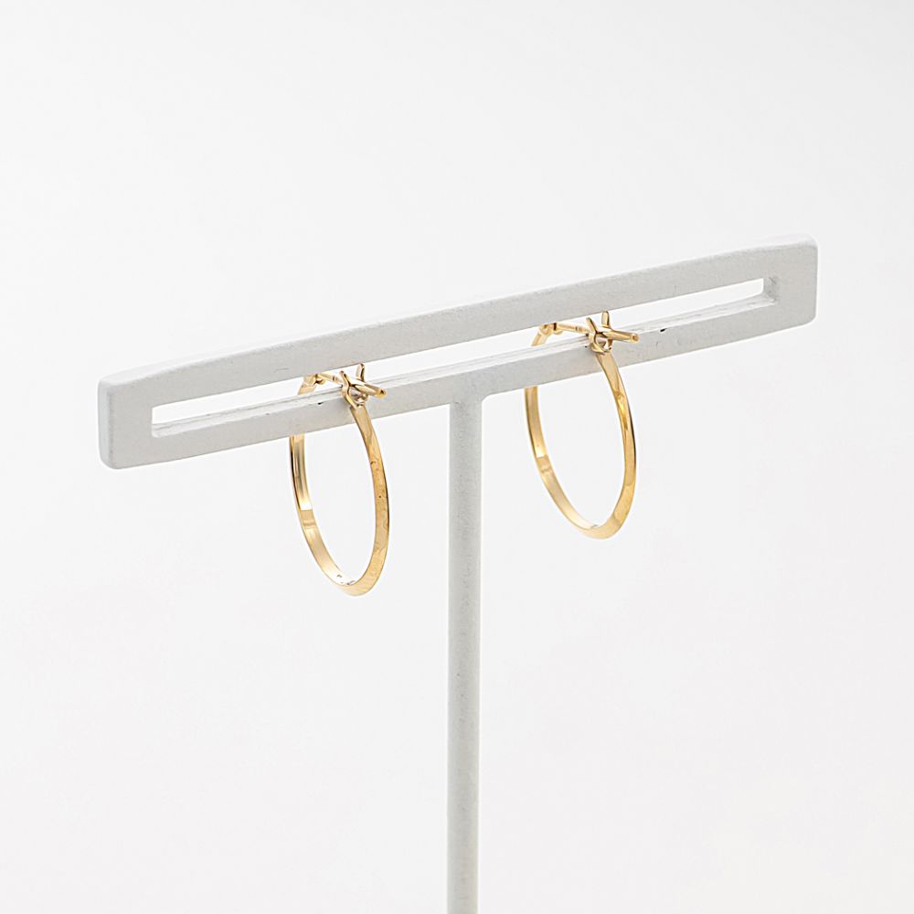 こちらのピアスは地金の輝きが美しいシンプルなデザインのフープピアスになります。イエローゴールドの輝きが、耳元からスタイリッシュな印象を与えてくれます。程よいサイズ感のフープピアスは他のジュエリーとの合わせやすさも魅力のひとつです。