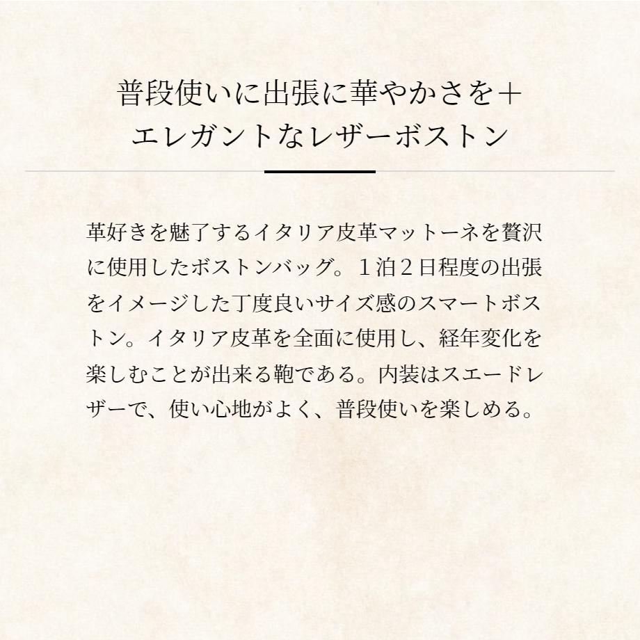 1泊2日程度の出張をイメージした丁度良いサイズ感のスマートボストンになります。イタリア皮革を全面に使用し、経年変化を楽しむことが出来る鞄です。内装はスエードレザーで、使い心地がよく、普段使いを楽しめます。