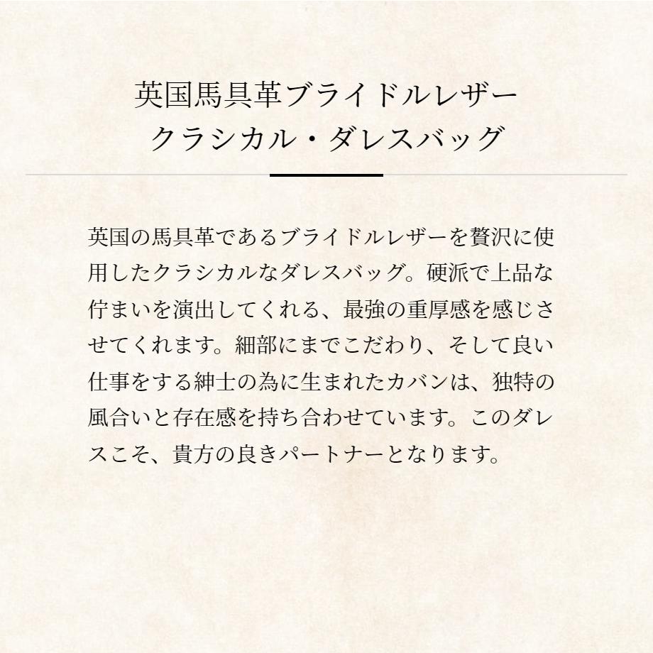 英国の馬具革であるブライドルレザーを贅沢に使用したクラシカルなダレスバッグです。硬派で上品な佇まいを演出してくれる、最強の重厚感を感じさせてくれます。