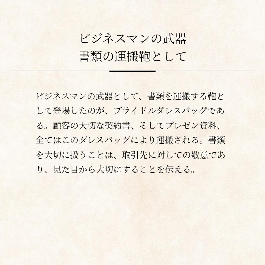 細部にまでこだわり、そして良い仕事をする紳士の為に生まれたカバンは、独特の風合いと存在感を持ち合わせています。このダレスこそ、貴方の良きパートナーとなるバッグです。