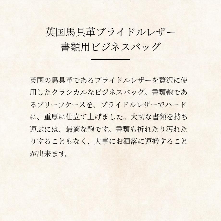 書類カバンのブリーフケースをブライドルレザーでハードで重厚に仕立てていますので、大切な書類を持ち運ぶのにおすすめのカバンとなっています。幅・マチもあるため、大切な書類を折り曲げたりする必要もなく、キレイな状態で持ち運ぶことができるカバンです。