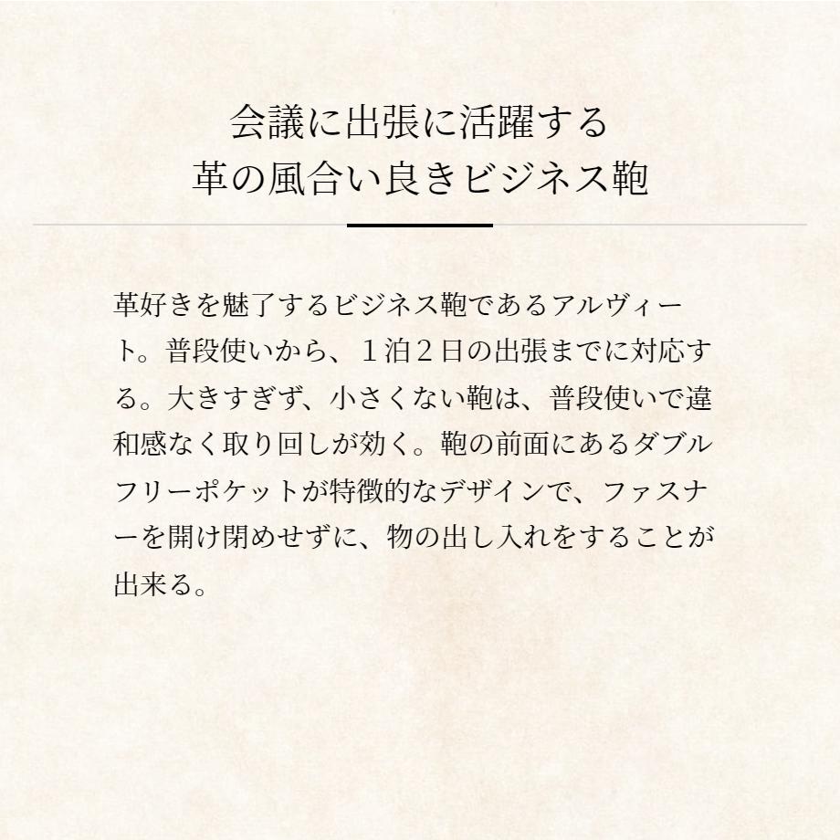 革好きを魅了するビジネス鞄であるアルヴィートです。普段使いから、1泊2日の出張までに対応するサイズになります。大きすぎず、小さくない鞄は、普段使いで違和感なく取り回しが効くバッグです。