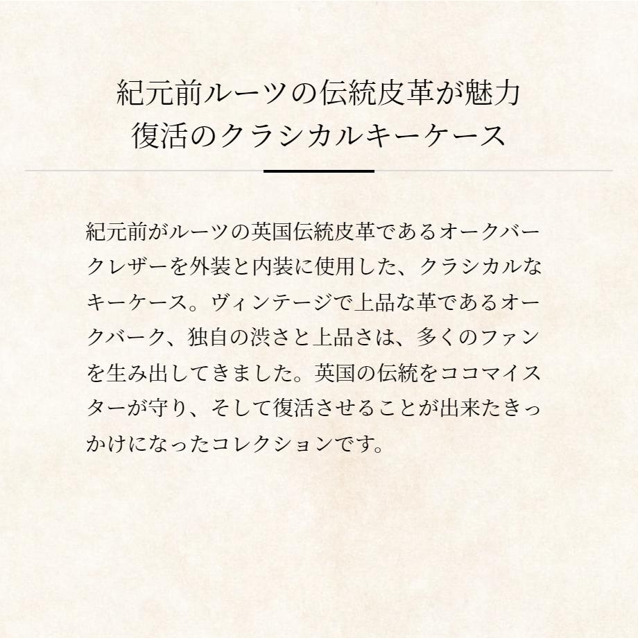 ココマイスターのキーケースはさまざまな革の素材が用意されています。オークバークは紀元前のイギリスで生み出された、伝統的な鞣(なめ)しの工法で、作られています。1年以上の手間をかけて作るので量産ができないため、希少価値が高く、高級な革靴などに用いられる革材です。