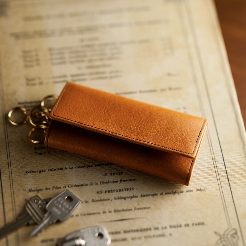 手に馴染む極上の質感に魅了され、経年変化と呼ばれるエイジングで、革を育てる事が出来るキーケースです。革を折りたたむクラシカルな形のキーケース、中にある鍵を革を巻くようなイメージで保管するデザインで、重厚感があります。