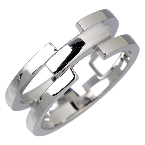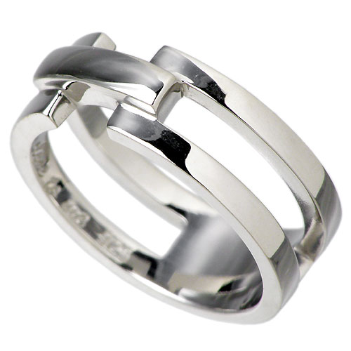 クラウン、クロス、ブランドロゴで構成された透かしのリングです。着ける向きにより変化を楽しめるデザインになっています。